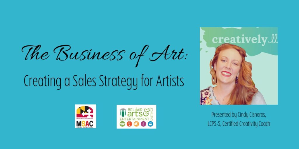 | Register now for The Business of Art: Creating a Sales Strategy for Artists! For artists, sales can feel intimidating, but learning how to sell confidently is vital for career sustainability. This session, presented by certified creativity coach Cindy Cisneros, will provide strategies for selling art, setting prices, and developing relationships with potential buyers.If you are dreaming of turning your passion for art into a thriving business, this presentation will empower you to create a roadmap to a sustainable career in art! Class will be held on Saturday, October 25, from 11 am to noon in the Community Room of Bel Air’s Town Hall, 39 N. Hickory Avenue, Bel Air, MD. Admission is FREE, but pre-registration is required. Space is limited! This lecture is made possible through the Bel Air Arts and Entertainment District with a grant from the Maryland State Arts Council. |