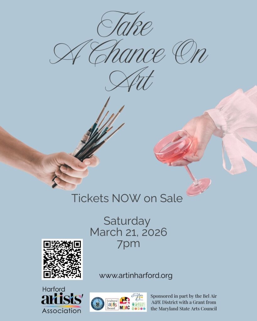Harford Artists’ Association presents Take a Chance on Art on Saturday, March 21 from 7 to 10 pm! Enjoy an elegant evening out at the Bel Air Armory with delicious food and wine. Best of all, ticket holders will participate in an art lottery and take home a piece of original art created by a member of our talented community of artists. Select your list of favorites, wait with exciting anticipation until your number is drawn, and take home one of your top picks. Everyone wins in this lottery!