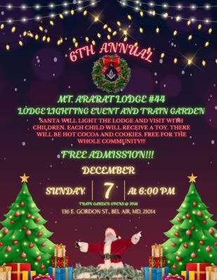 December 7 @ 3-9pm – Mt. Ararat Lodge will hold an official holiday lodge lighting at 6 pm. Following the lighting, Santa will be available in the lodge room, where children can sit with Santa and have pictures taken with him. Each child can also choose a FREE toy. This event is open to the public and free to attend. At the Christmas Train Garden, cookies, popcorn, & hot chocolate will be served.
