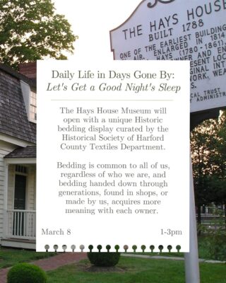 The museum will reopen on March 8 with the first in a series of programs on daily living in days gone by. The Hays House Museum will open with a unique Historic bedding display curated by the Historical Society of Harford County Textiles Department. Antique and vintage bedding evokes both a real and imagined connection to family—whether ours or one completely unknown to us—and a sincere appreciation and awe of the hands that created these warm coverings. Bedding is common to all of us, regardless of who we are, and bedding handed down through generations, found in shops, or made by us, acquires more meaning with each owner. Visit this year’s opening exhibit to learn more about the bedding of our forefathers and view beautiful quilts and bedding from days gone by. The exhibit will remain on display until mid- April.