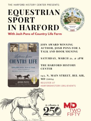 Join award-winning author Josh Pons for a talk and book sigining. Mr. Pons book is based on letters he found in the basement of his farm. They outline the amazing story of Harford County’s Country Life Farm and the family’s role in the horse racing industry during the Great Depression and beyond. This is one you won’t want to miss!