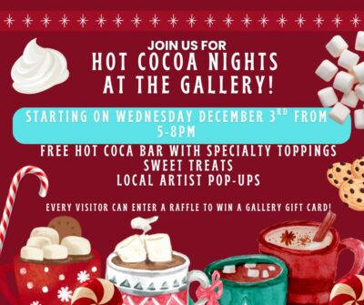 Join Harford Artists Gallery the first three Wednesdays in December for a sweet escape into art and flavor! Sip from our decadent hot cocoa bar, complete with specialty toppings, and browse handcrafted treasures from local artists. Cozy vibes, creative finds, and cocoa magic await! What is your favorite cocoa topping?