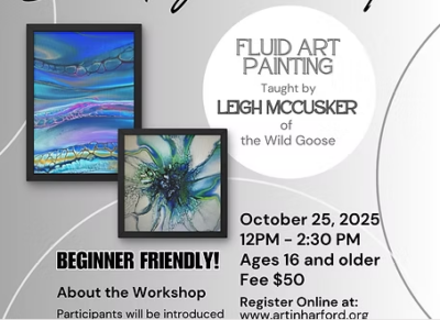 Participants will be introduced to 2 fluid art techniques: swipe method and bloom blow-out. Prepare to get messy and let your imagination go wild! All supplies are provided. And be ready to have some fun! Limit to 8 participants. Ages 16+. All supplies included in workshop fee of $50.